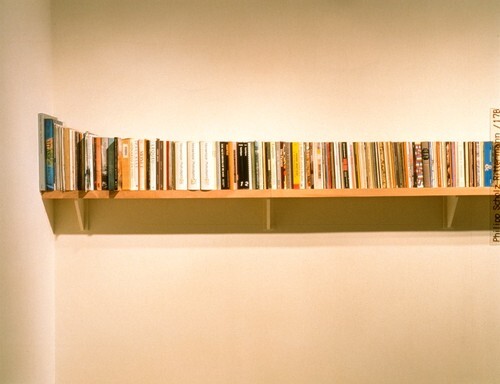 Titled "Unpacking my Library/Desempacando mi biblioteca," Buzz Spector's project for inSITE94 was located at the University Art Gallery on the campus of San Diego State University. As the title suggests, the installation consisted of the artist's private library of books. A single continuous shelf mounted on the wall of the gallery space and running he length of all four walls held the artist's books arranged by size, from large to small. Rather than organizing the books alphabetically, by subject, or by author, the artist chose to present them based on an aesthetic and an order seemingly random and foreign to the way we generally regard books. --inSITE94