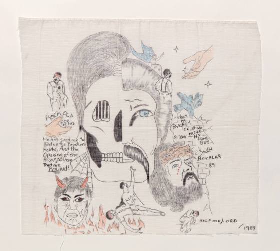 Face at center - half skull and half human; Devil figure at lower left with the figures of men burning in hell or being "isolated"; contains text and names.