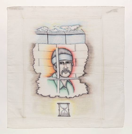 Portrait of a man wearing headband or bandana; positioned in front of a brick wall with fence and behind bars; hourglass at bottom center of composition.