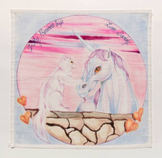 Inscribed "To my precious wife / Love Daddy" with cat touching a unicorn's head with paw, pink sunset in background.