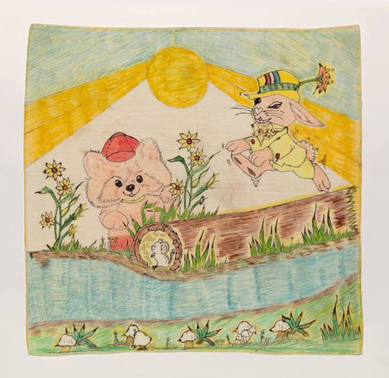 Cartoon animals playing outdoors (mouse, teddy bear, rabbit); mushrooms along stream and yellow sun rays.