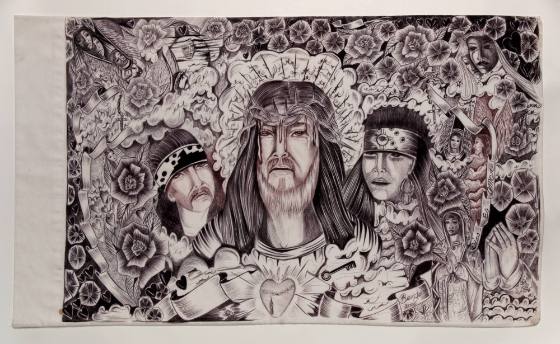 Jesus with sacred heart at center, flanked on either side by a man and woman; various religious symbols - praying hands, virgin Mary, crucifix and rosary, etc. Banner: Dios Es Amor.