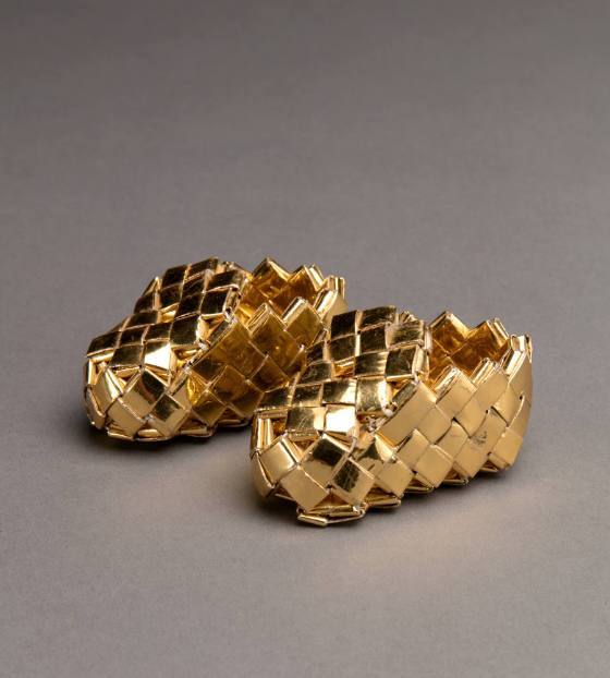 A set of children's shoes made out of gold colored wrappers. This record is for one shoe.