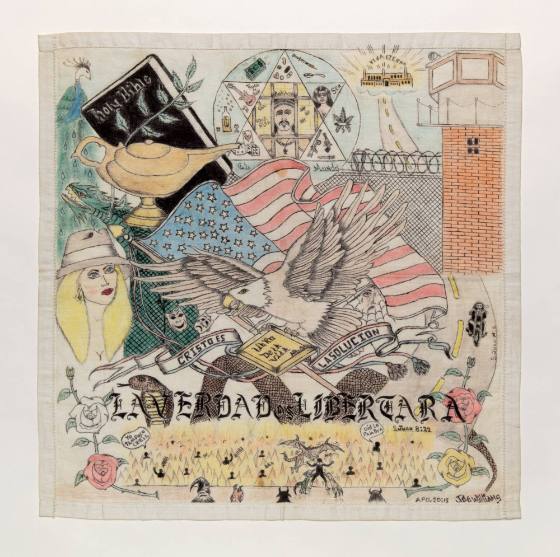 Series of images around an American eagle and flag at center; Bible and Bible verses, prison tower and figures. Includes text: vida eterna; Cristo es la solucion; Libro de la Vida; La Verdad es Libertara.
