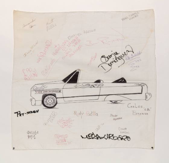 Chevy Impala convertible low-rider with YDI Gang Intervention on the front fender; signatures.