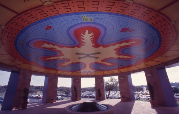 The Ollin Rotunda Mural, located at the University of Texas, San Antonio, satisfies the requirements of the commission with three components: Texas history, Indigenous history, and science. The central image is the ollin symbol, the Aztec hieroglyph indicating movement and change. It is surrounded by the seven caves, Chicomoztoc, the place of Aztec origins as depicted in the codices. The composition of the seven caves also resembles an abstracted rendering of the dendrites in the human brain. The blue section contains neurons and engrams of the brain. For the scientists who selected the artist's design, the dotted patterns on the surface of the blue field resemble DNA. The concept for the ochre yellow band is derived from ancient Indigenous pictographs at Monte Albán and Maya disks used in the ball courts. This final outer ring includes symbols representing the Pecos River area that borders Texas and Mexico. The colors are inspired by multiple sources, including colors of the Maya manuscript known as the Dresden Codex and ceramics from colonial Puebla, Mexico. Alice Adams (b. 1930) designed the fountain below the mural. Acrylic emulsion on plaster. Dimensions: 43' in diameter.
