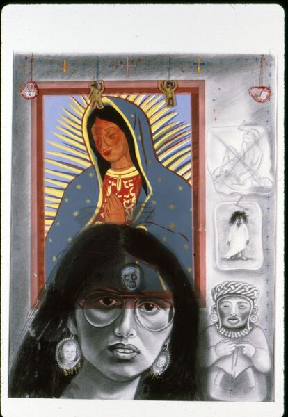 This self-portrait is composed of multiple media including three-dimensional milagros created of paper and thread. The image of the Guadalupe is appropriated from a serigraph or silkscreen print created at Diseño Studios in Austin, Texas. The self-portrait that covers the bottom portion of Guadalupe is a charcoal drawing. Three images appear on the right side: the top image is a portrait of Popocatépetl and Iztaccíhuatl with an "x" mark of refusal, the middle figure is a dream-image, and the bottom image is inspired by a Mesoamerican goddess. A work of mixed media with pencil, charcoal, ink, embroidery thread, ribbon, tulle, and paper. Dimensions: 20" x 28"