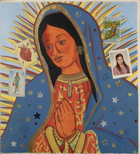 The cover of the artist book depicts Guadalupe/Tonanzin. The work honors the women in her life, including Coatlicue, Guadalupe, Barraza’s great-grandmother, grandmothers, mother, and her daughter, Andrea. This is a mixed media work with ribbons, milagros of amate paper, tulle, lace, thread, hair, appropriated family photos, glitter, sequins, safety pins, and hand-colored prints and photocopies. It also includes a self-portrait panel. Artist book. Opened dimensions: 10 ¾” x 80"