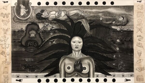 This drawing was created during a residency of the Nepantla Project organized by Gloria E. Anzaldúa (1942-2004) in Saratoga, California. The artist reimagines Michelangelo's representation of the Creation of Man as portrayed in the Sistine Chapel. Rather than God touching Adam to bestow life force, the artist presents a feminist and Indigenous moment of creation. The central image is La Llorona, whose face has tattoos that signify death, and thus infinity, as she emerges from the maguey. Coyolxauhqui's hand reaches down from a cloud and touches the maguey, which animates La Llorona, giving her life. Rain drops depicted as the Eye of God nourish the earth and prepare the soil for harvest. The outer band produced in acrylic paint contains symbols of South Texas, hieroglyphs, and parts of the Moon Goddess's body. Charcoal drawing and acrylic on canvas. Dimensions: 112" x 74"
