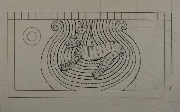 This drawing specifies the design for a section of the frame of the Retablo Codex Mural at the University of Texas, San Antonio. The rabbit represents the moon or Coyolxauhqui, the moon goddess. The concentric circle represents a rain drop. Ink on vellum. Dimensions: 6" x 11 ½"