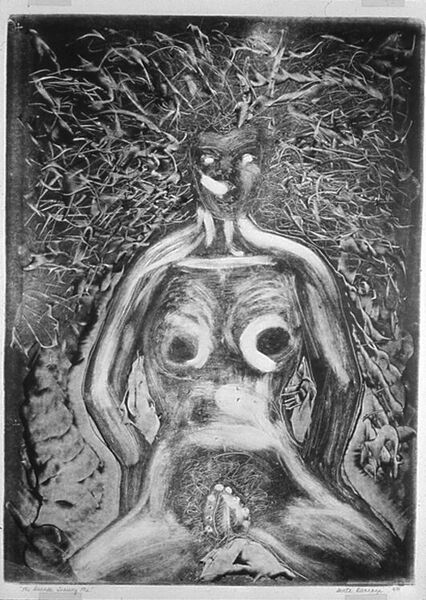 This print is from the Dream Series. The nude figure holds the steps to the Underworld on her vulva, and the hair on her head is energized with movement. Monoprint. Dimensions: 22" x 28"