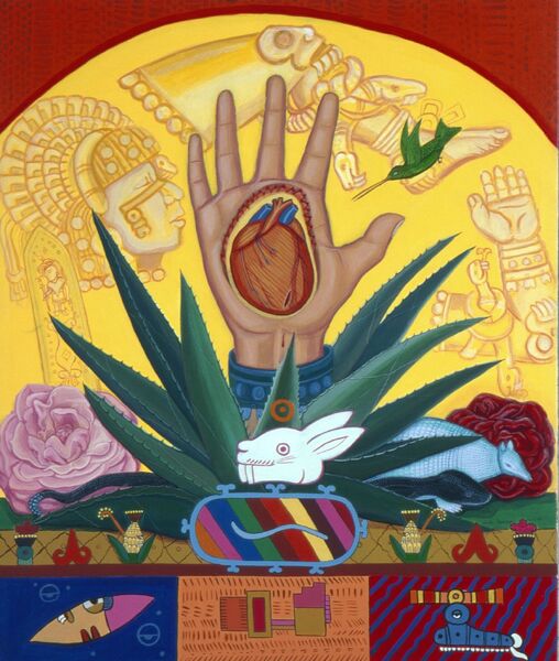 This painting was created during an artist residency of the Nepantla Project organized by Gloria E. Anzaldúa (1942-2004) in Saratoga, California. The central image is the Almighty Hand reimagined as the hand of Coyolxauhqui that emerges from a maguey and is surrounded by symbols. It is influenced by Anzaldúa's philosophy about Coyolxauhqui and the coming era of women's empowerment. Acrylic on canvas. Dimensions: 39" x 48"