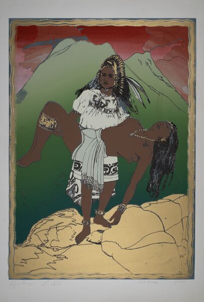The artist used a posed photograph of Sylvia Orozco and Pio Pulido (1950-2018) as resource material for the serigraph. It depicts the iconic image of Iztaccihuatl and Popocatepetl in reverse roles to convey a feminist perspective. Serigraphy. Dimensions of image: 21 ⅜” x 15 ¼”