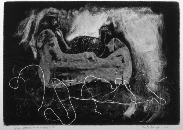 This print is from the Dream Series. In the dream the artist saw a curandero holding the chacmool with a duck on its belly, which he will use to retrieve the artist’s sister's lost soul from the Underworld. Later, Santa Barraza learned at the exhibition, The Road to Aztlan: Art of the Mythic Homeland, that the duck of her dreams resembles an ancient Mesoamerican ceramic, likely Olmec. Monoprint. Dimensions of the image: 11 ¾" x 16 ¾"