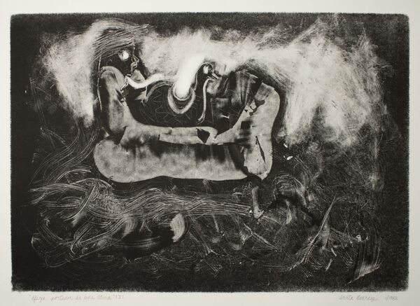 This print is from the Dream Series. The image is influenced by the artist's research on shamanism and recurring dreams of trying to heal her sister. The central image is chacmool. Monoprint on Italia paper. Dimensions of the image: 11 ½" x 16 ¾"