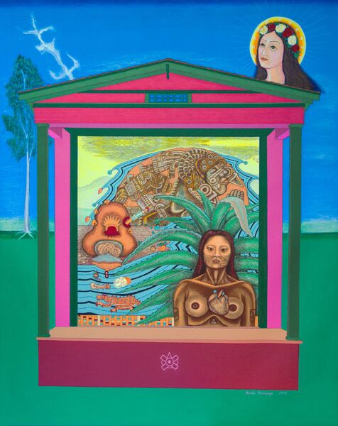 From the Mujeres Nobles Series, the artist printed her serigraph onto canvas and attached the image onto another canvas, on which she painted a house and other elements around the collage. The healing tree and cloud locate the artist in South Texas. The ollin hieroglyph appears in the foundation of the shotgun style house, an architectural style well-known in Texas. St. Philomena, the child martyr, appears above the home to safeguard it. Multimedia. Dimensions: 60" x 50”