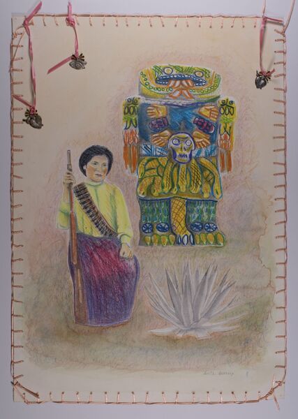 The work depicts Coatlicue and La Adelita, appropriated from a Agustín Víctor Casasola (1874-1938) photograph of the Mexican Revolution. Mixed media with manipulated collagraph. Dimensions: 18 ½” x 13"