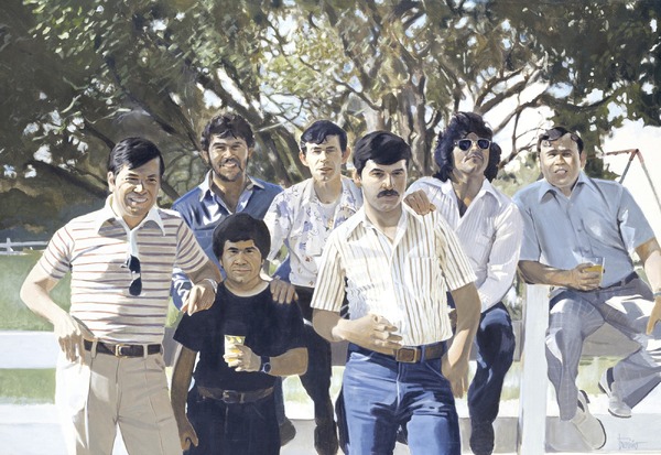 This photorealistic painting of acrylic on canvas was created from a photograph taken during a family get-together. The artist was so inspired by what the camera had captured that he decided to commit it to canvas. The hairstyles and men’s clothing are characteristic of the 1970s. In the painting, smooth brushstrokes recreate the soft and gentle nature of the moment. Nothing about this piece alludes to rigidity; there are no hard, straight outlines or cold colors. Many of the colors used are greens, soft blues, yellow, and white. The image exudes a feeling of home and comradery. The body language between the men suggests a close bond. The intimacy of the moment allows us to better understand the internal dynamics between them. It seems that traditional masculine roles usually associated with Chicanos are not present. Both popular images and Chicano art often show Chicanos with serious and sometimes emotionless faces to reinforce strength and resilience. However, this is not the case here. The men portrayed are smiling with their arms around each other looking content and serene. The image suggests that masculinity is not rigid and that men can be loving and affectionate. Jesse Trevino conveys the sense of community he experienced as a Chicano in the neighborhoods of San Antonio, Texas. (Author: Oziel Valle)
