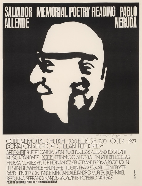 Rupert García, Salvador Allende Memorial Poetry Reading Pablo Neruda, 1973, offset lithograph, Smithsonian American Art Museum, Gift from the Trustees of the Corcoran Gallery of Art (Museum Purchase, Gift of Richard Rodriguez), 2020.20.79, © 1973, Rupert García