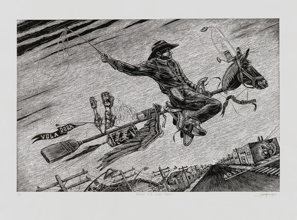 Juan de Dios Mora, Montando a la Escoba Voladora (Riding the Flying Broom), 2010, linocut, Smithsonian American Art Museum, Museum purchase through the Frank K. Ribelin Endowment, 2019.35.2, ©2019, Juan de Dios Mora
