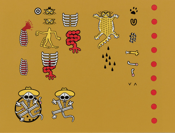 Michael Menchaca, An arrangement of logograms, presumably a sacrificial ornamentation, 2013, screenprint on paper, Smithsonian American Art Museum, Gift of Drs. Harriett and Ricardo Romo, 2019.50.20, © MMXX, Michael Menchaca