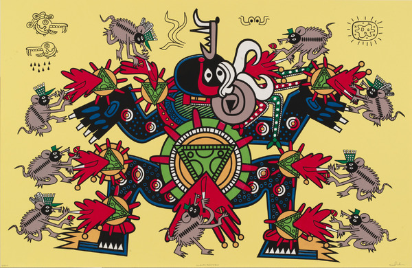 This screen print portrays a fantastical scene in which a monstrous creature, adorned with a green triangular emblem resembling Swiss cheese, stretches out its clawed arms against a backdrop of blue-black skin. It is besieged by rats donning green caps, engaged in a fierce assault, with some wielding stabbing weapons and others attempting to bind the creature's neck. With humor, the artwork draws inspiration from Mesoamerican artistic motifs and symbols, combining elements of myth and imagination with a nod to ancient cultural aesthetics. (Author: Juan Sarmiento)